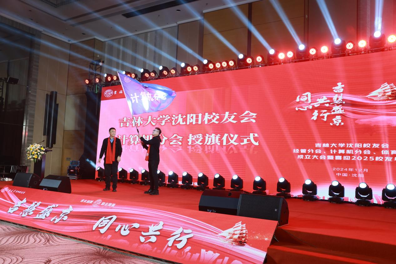 友会副秘书长尹彪,为沈阳校友会计算机分会授旗。这面旗帜,不仅承载着母校对校友们的殷切期望,也标志着计算机分会正式扬帆起航,开启新的征程。