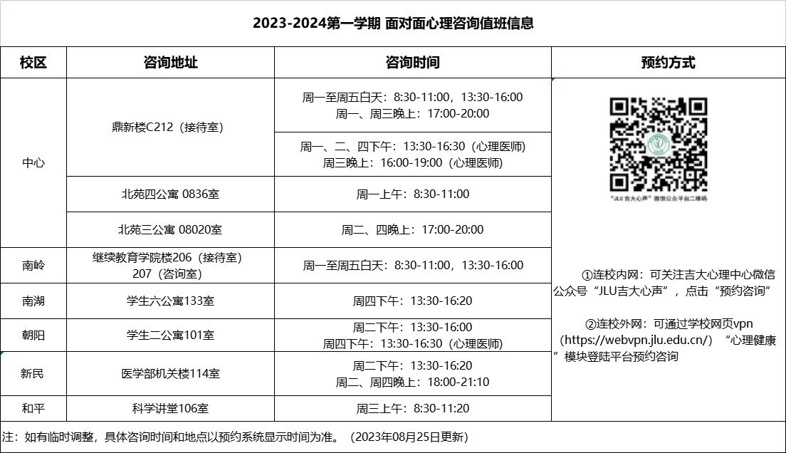 各校区面对面心理咨询信息详见下表,如有临时调整,请以预约系统的可预约时间为准: