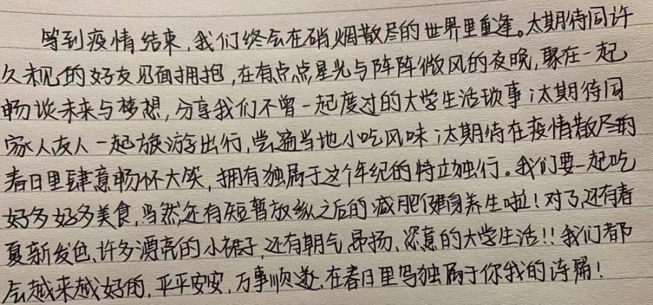 同学们对本次活动的参与热情十分高涨,纷纷通过手写文字的形式表达自己在疫情期间的所闻所感所想,并畅想了疫情结束后的生活情景。有的同学将自己的想法写成了一首小诗,有的同学用朴实的文字表达了真挚的期待。无论是和朋友美餐一顿,还是外出郊游踏青,这些美好的希冀都勾画出疫情退去后的斑斓图画,深深鼓舞了同学们以积极的心态面对当下的学习和生活。