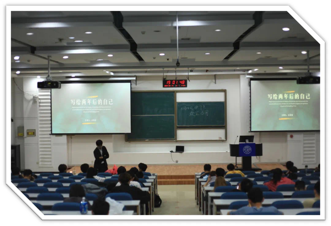 68名同学聚集在敬信教学楼十一阶梯教室,进行了一场别具一格的“写给两年后的自己一封信”活动,旨在鼓励同学们规划未来,激发个人成长潜力。在活动现场,主持人首先通过宣传和讲解活动背景和意义,吸引了众多同学们积极参与。接下来,同学们在轻松愉悦的氛围中开始给两年后的自己写信。大家认真思考、积极构思,将自己的思考和感悟融入到字里行间。有的同学写下了对未来的展望和计划,表达了对自己的期许和信心;有的同学则写下了对过去的回忆和感悟,表达了对自己的认识和成长。在信件写完后,同学们纷纷将信件放入特制的“时光胶囊”中,由秘书部精心保管。