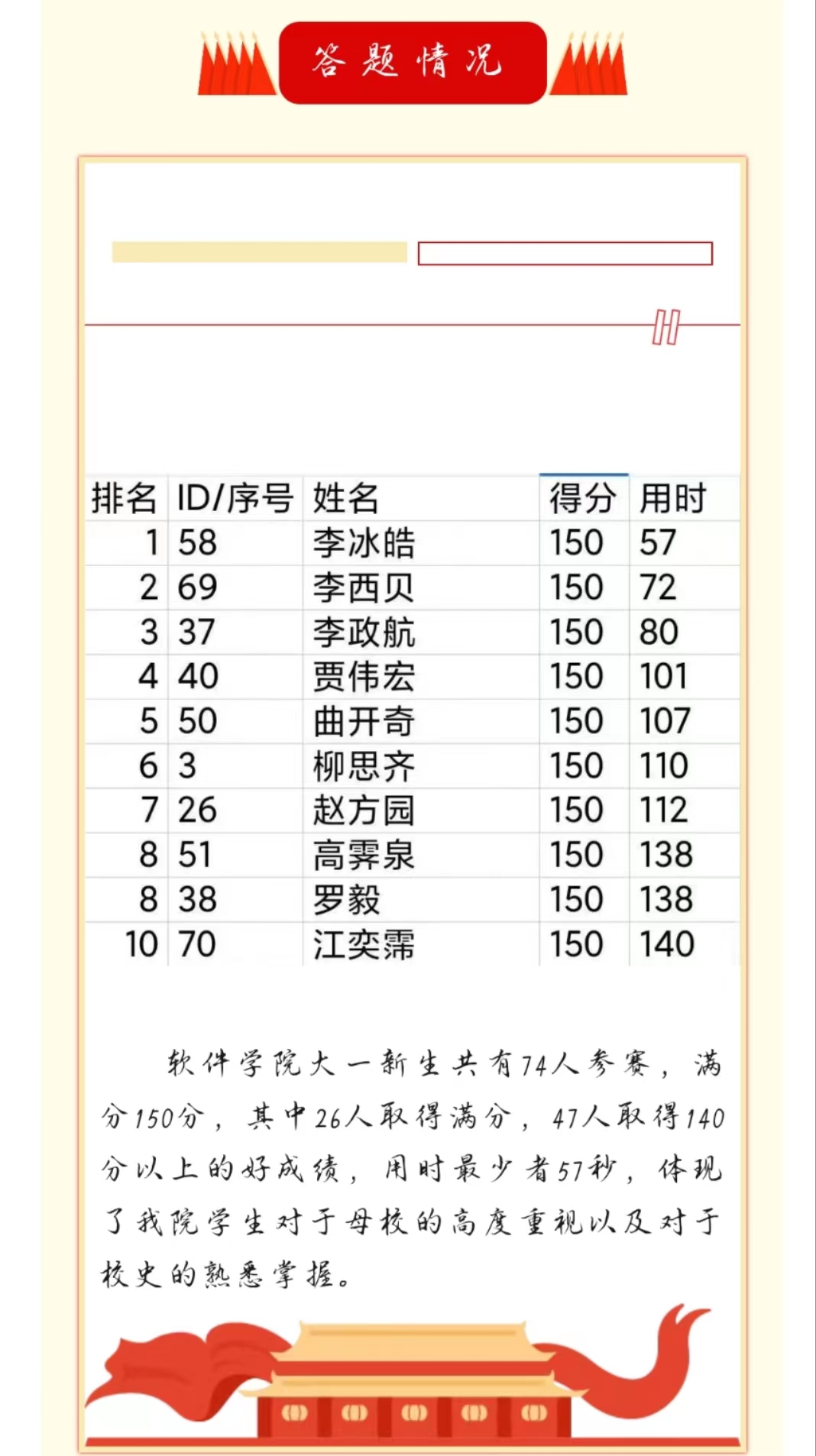 的发展历程和概况,为比赛做好了充足的准备。在比赛过程中,同学们反应迅速,精准作答,展现出对校史知识的熟练掌握和对母校的无限热爱。他们凭借对校史知识的深厚储备及出色的临场表现,赢得了现场观众的阵阵掌声。最终,共有26名同学取得了满分150分的好成绩,47名同学的得分超过了140分,答题最短用时仅57秒。赛后,许多同学表示,自己通过参与本次活动更真切地感受到六合彩开奖结果