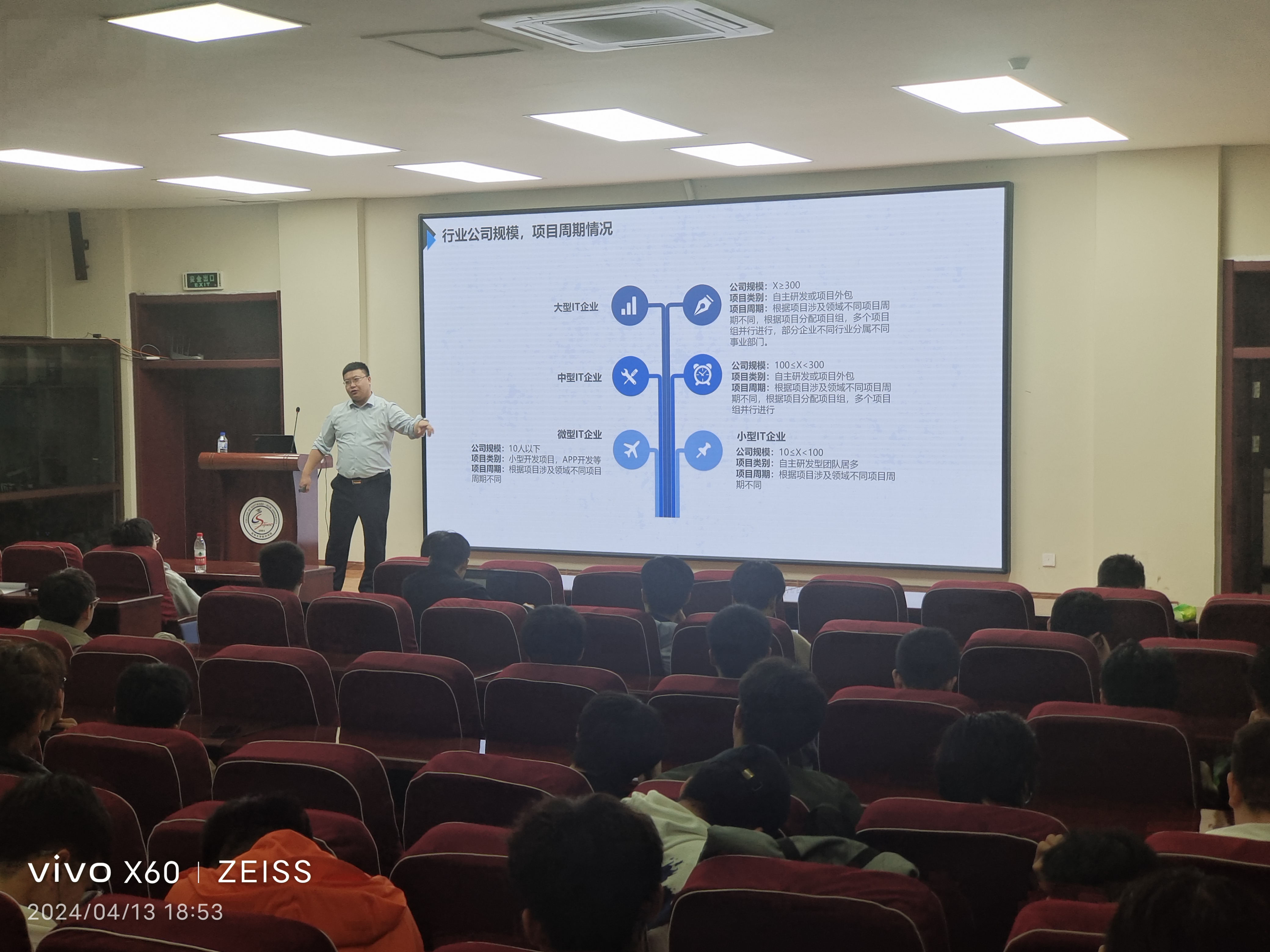 随后,主讲人向同学们简要概述IT行业内几家代表性企业的规模、项目周期等情况,结合具体案例的实际数据比较和分析不同规模企业在项目管理、团队协作等方面的差异和特征,帮助同学们更深入地了解行业生态和企业招聘需求。在此基础上,他建议大家在选择实习或就业单位时,要充分考虑自身兴趣和发展方向,明确自我定位和职业理想,同时关注目标企业的综合实力及成长前景。
