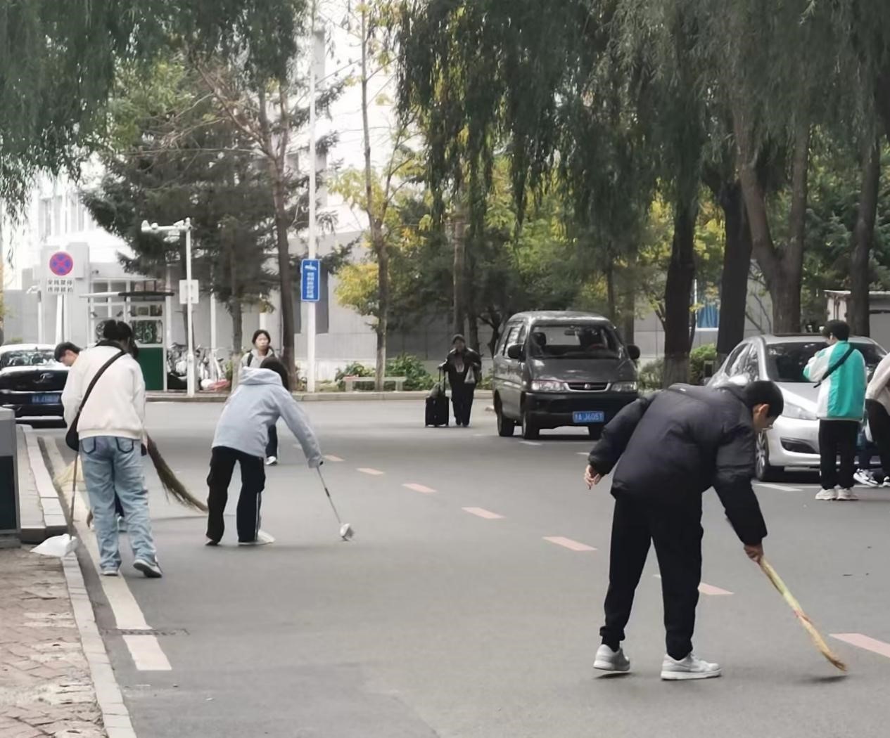 60名同学齐聚宋志平体育馆门前,手持扫帚、簸箕等清洁工具,整装待发。活动分为两队,每队30人,路线围绕校园一周,从宋志平体育馆出发,沿主干道进行落叶清扫,最终在东门汇合。