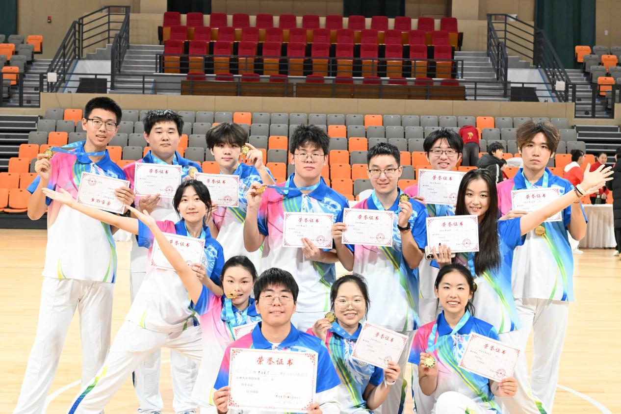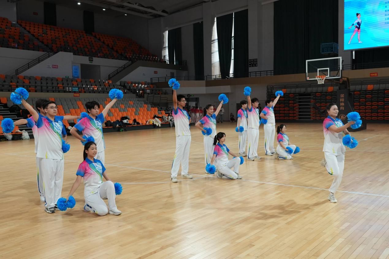 广泛动员同学参与,经筛选与训练,最终确定13名优秀学子组建代表队出征赛场。比赛现场,队员们身着统一健身服,伴随动感音乐踏入赛场。表演开始,队员们迅速分散,随后以流畅的队形变换展开表演,时而分散成错落有致的三角阵,时而聚拢成紧密规整的方阵,3次精心编排的集体配合造型将团队默契展现得淋漓尽致,5次灵动流畅的队形切换更是引得现场掌声不断。赛场上,队员们动作整齐有力,每一次伸展、每一次跳跃都精准踩合节拍,安全难度动作的融入为表演增添诸多亮点,收获观众阵阵欢呼。