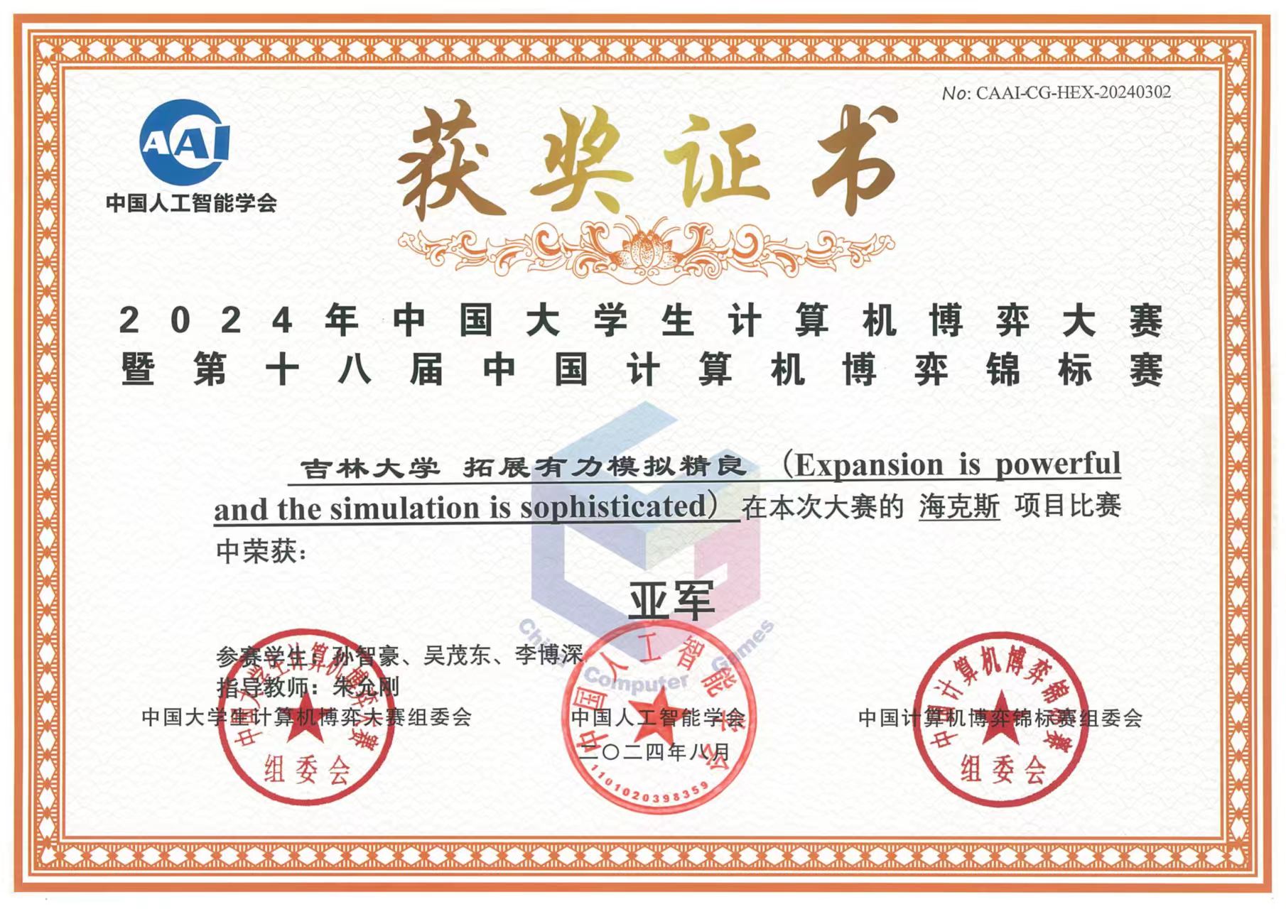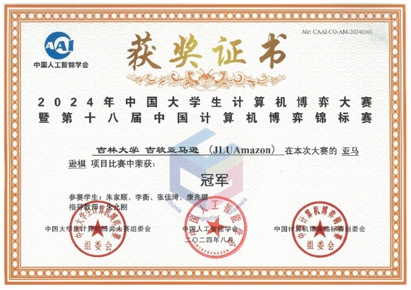 队伍发挥出色,最终获得全国一等奖8项、二等奖1项的好成绩。其中由朱家顺、李衡、张佳琦和康兆璐组成的吉软亚马逊(JLUAmazon)队在亚马逊棋项目中获得全国冠军,由孙智豪、吴茂东、李博深组成的拓展有力模拟精良(Expansion is powerful and the simulation is sophisticated)队在海克斯项目获得全国亚军。充分体现了六合彩开奖结果